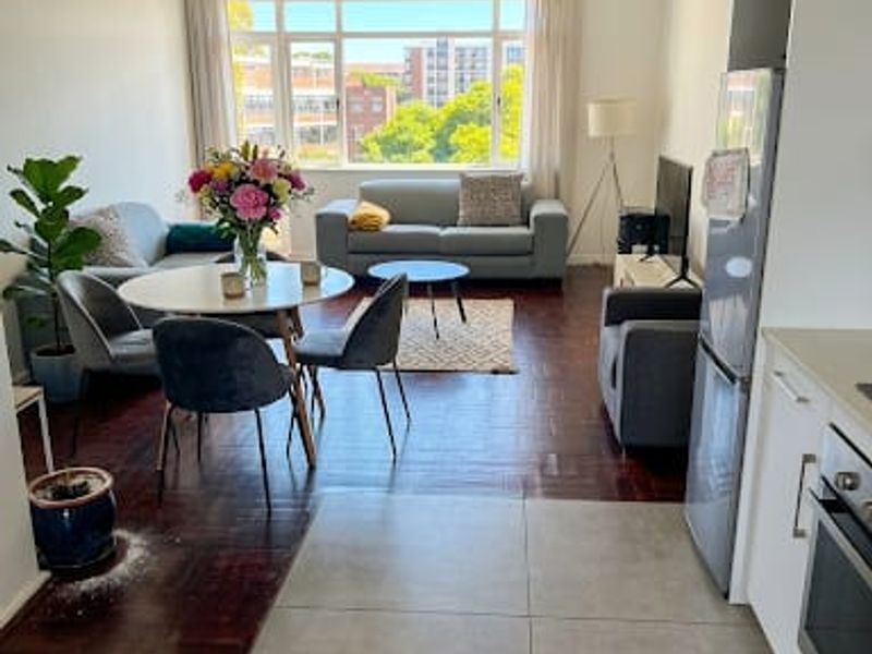 Enjoy vibrant Illovo city living with a sunlit balcony and sweeping urban views, plus landscaped gardens and pool — renovated open-plan apartment with two bedrooms, 1.5 baths and covered parking.