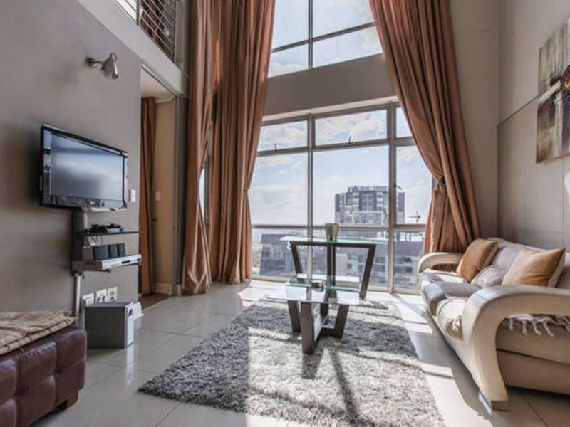 Experience Sandton CBD living in this furnished Hydro Park loft: double‑volume interiors, two private balconies with skyline views, modern kitchen and workspace — one bedroom, two bathrooms, three parking bays.
