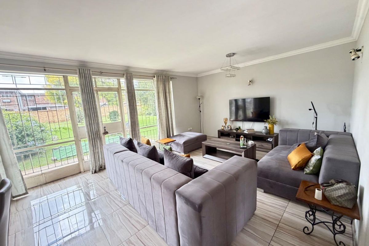 As you step inside, you'll be greeted by an open-plan lounge and dining room, elegantly finished with beautiful tiled floors. The lounge features glass doors that lead out to a spacious common garden area, offering a seamless indoor-outdoor living experience perfect for relaxation and entertainment.