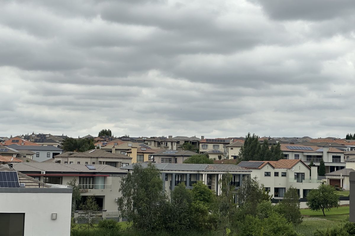 Golf-course living in Blue Valley Golf Estate with sweeping skyline views — perfect for entertaining on the patio with built-in braai and expansive garden; four beds, 4.5 baths, covered parking.