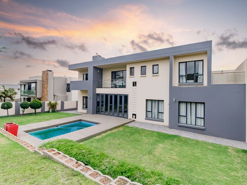 Golf-course living in Blue Valley Golf Estate with sweeping skyline views — perfect for entertaining on the patio with built-in braai and expansive garden; four beds, 4.5 baths, covered parking.