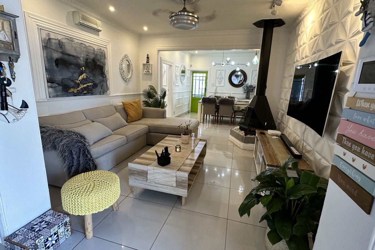 This very quant family home has a beautiful open plan entrance, lounge and dining room with new Italian floor tiles, lovely light fittings and amazing wall decorations making it stand out from the rest and a pleasure to come home to. The open plan lounge and dining room forms a large family friendly area and has both an aircon and fire place for combatting warm summer days and cold winter nights. There are 2 bedrooms with built-in cupboards, while the main bedroom has a huge walk-in closet, suitable for a baby room, study or games room. Both bathrooms are beautifully tiled to the ceiling, have been revamped recently, and both have showers over the bath. The kitchen has an undercounter electric oven with a glass hob (not working), as well as a separate gas hob, and is complemented by a separate laundry and a large walk-in pantry. The huge covered stoep is really a pleasant outdoor space close to the pool and just to kick back and relax. Outside there is a sizeable pool, needing some TLC. There is a separate entertainment area, optional for R2,500pm, consisting of a bar with guest toilet, and cinema room which is work in progress, with a jacuzzi (not operational) and a built-in braai and pizza oven which makes an awesome, private entertainment area. There is a safe carport and everything is behind a high wall which makes it very private. This home has lots of space and is a real cozy and special family home.