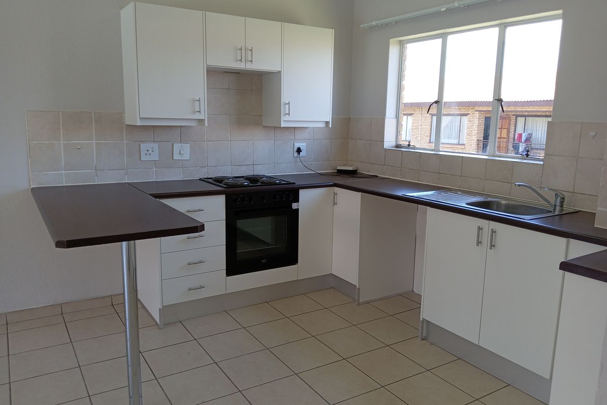 The property includes two tiled bedrooms, each featuring built-in cupboards, and a bathroom with a convenient shower over the bathtub. The contemporary open-plan kitchen offers plenty of cupboard space and comes with a brand-new stove.