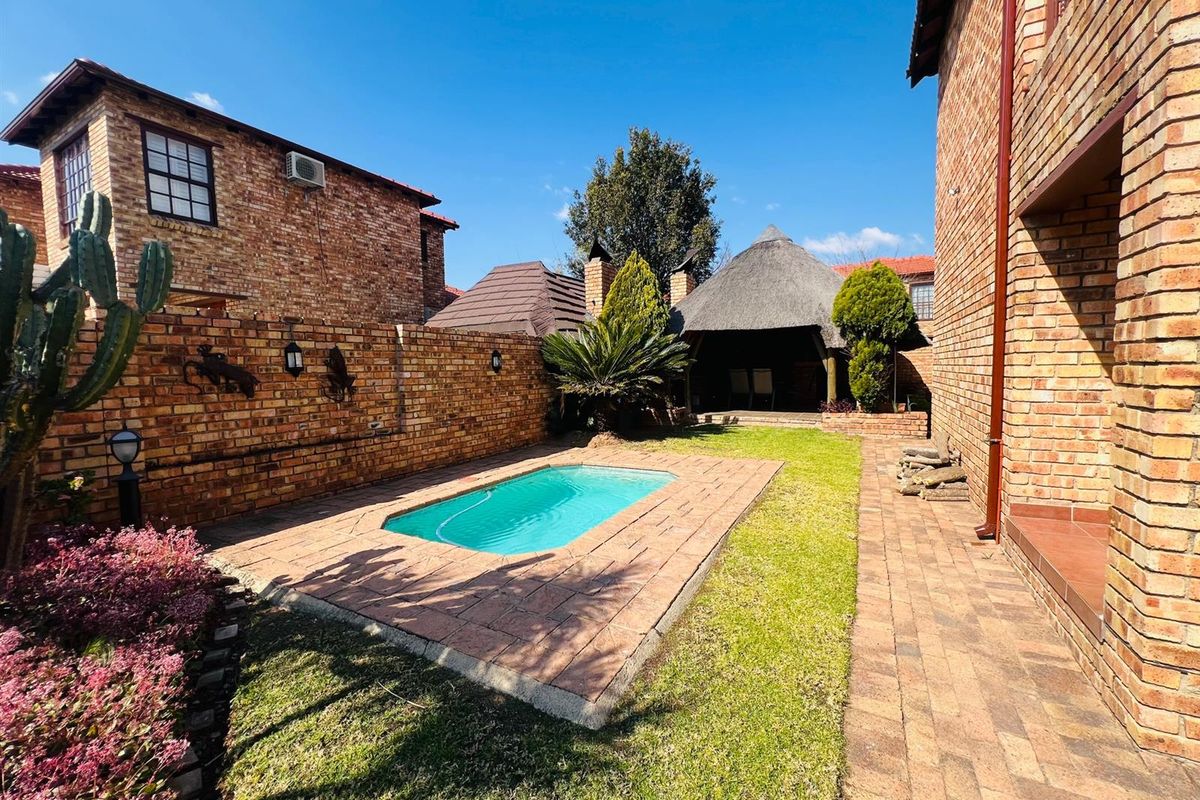 Effortless family living in Kyalami, Gauteng — two-story home with open-plan flow, three bedrooms, two bathrooms, and a private pool with backup power for uninterrupted leisure.