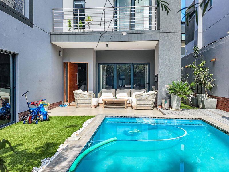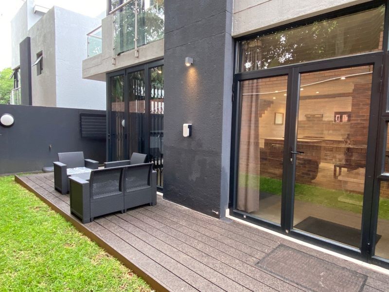 Embrace secure boutique living in Bryanston, near Bryanston Shopping Centre and Sandton. Entertain on a covered patio and serviced private garden; sleek modern kitchen, 3 beds, 3.5 baths.