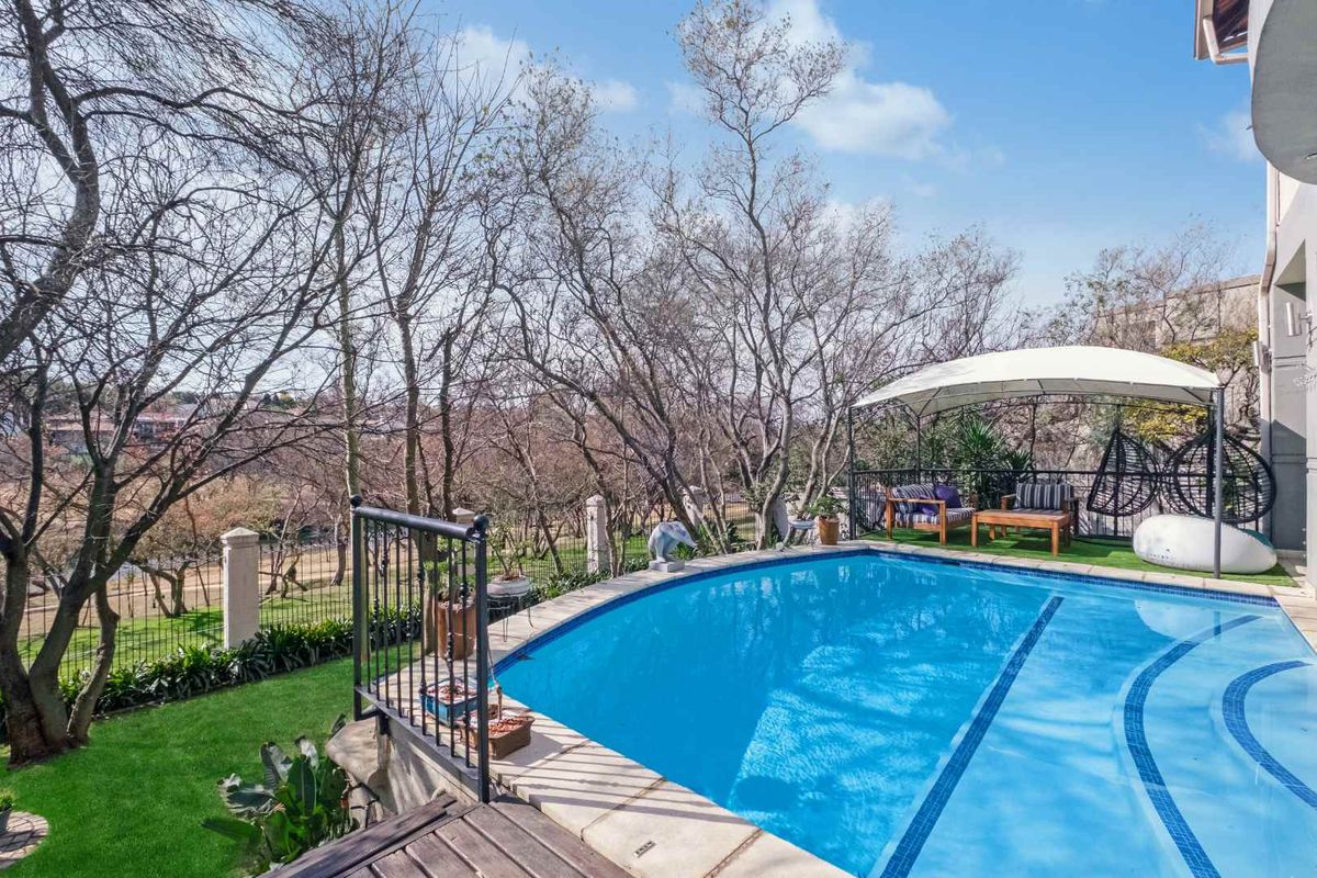 Entertainer's riverside retreat in Dainfern Valley, offering expansive covered patio with gas braai, rim-flow pool and inverter backup — five bedrooms, 5.5 baths and 3.5 garages.