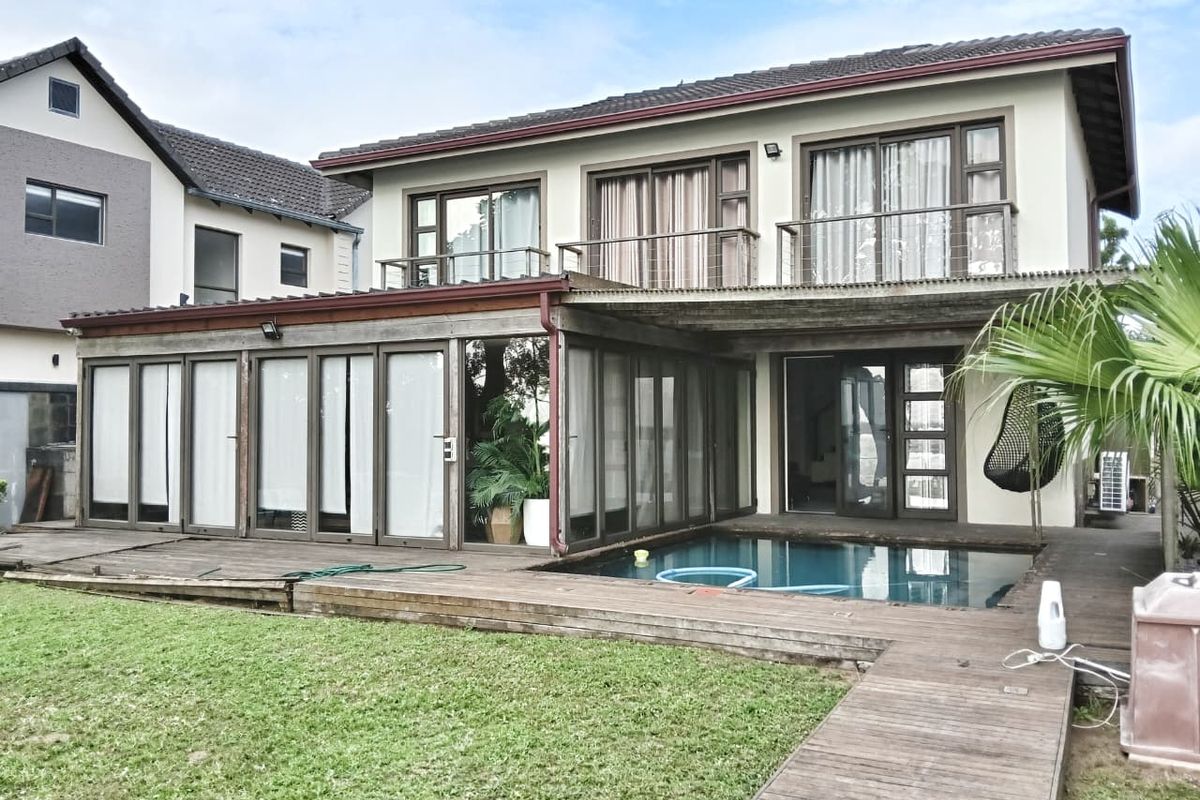 Step through the elegant foyer of this prestigious fully furnished residence and immerse yourself in a world of sophisticated, open-plan living. The heart of the home features a seamless flow between a spacious lounge and a gourmet, modern kitchen designed for the culinary enthusiast. Boasting sleek Caesarstone countertops, a center island with a breakfast nook, a high-end gas stove, and a discreet separate scullery, this kitchen is as functional as it is beautiful. The living area expands effortlessly through aluminum stacker doors into a magnificent sunroom and entertainment hub. Surrounded by glass on all sides, this space opens onto an expansive wooden deck, complete with a built-in braai and a sparkling swimming pool, all set against the backdrop of a lush green lawn and breathtaking, unobstructed views of the Mzingazi Lake.