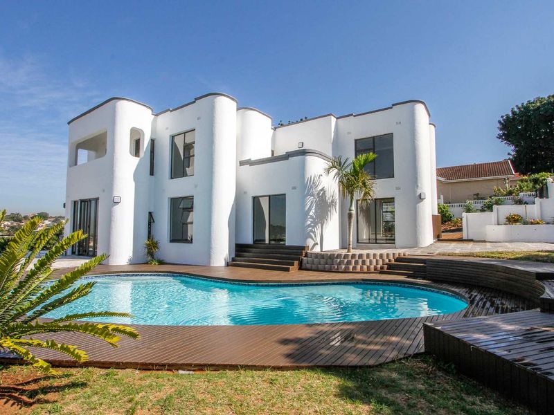 Seaside entertaining in La Lucia — open-plan living flows to a decked pool and ocean views, large garden, chef’s Caesarstone kitchen; six bedrooms, 3.5 baths, double garage.