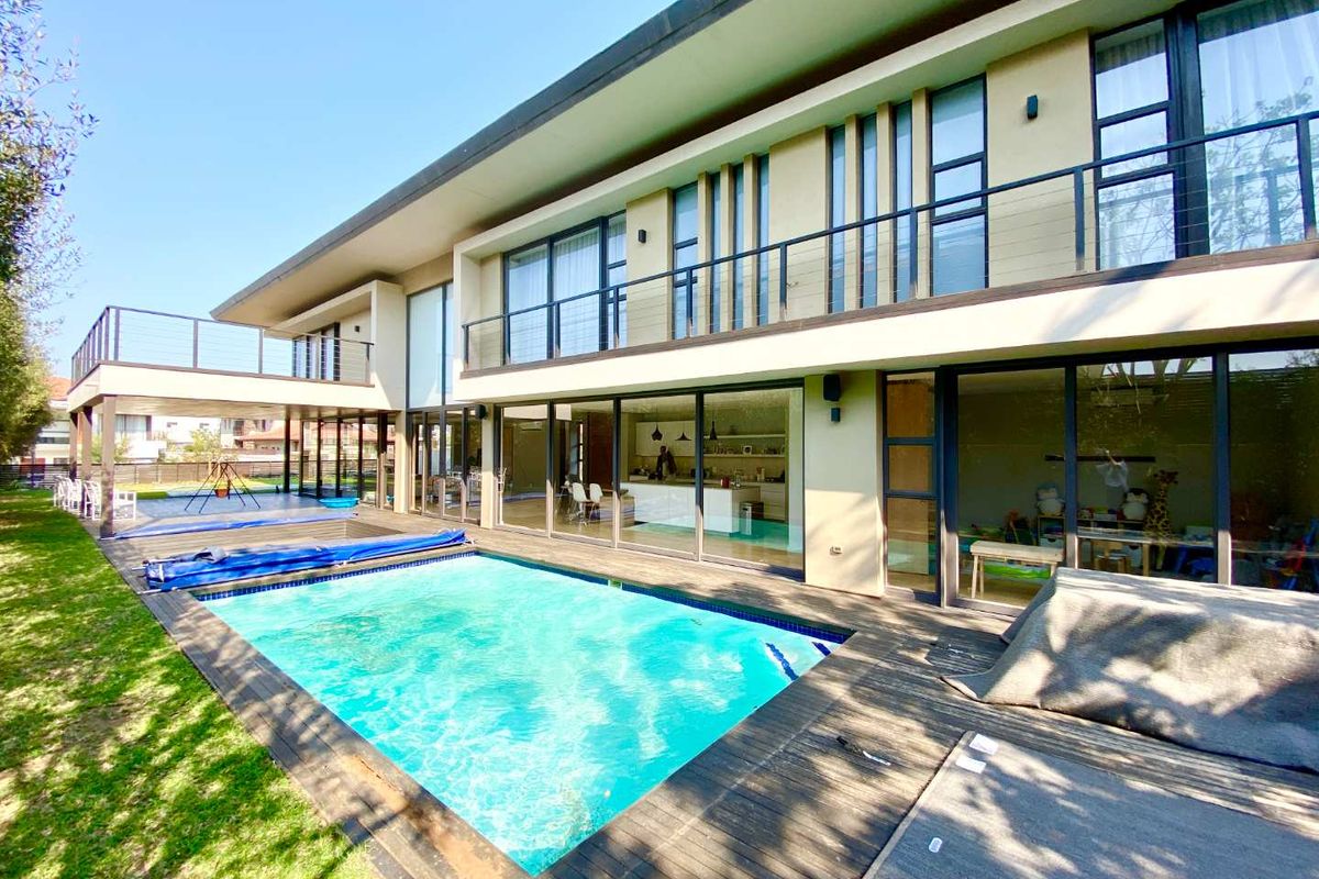 Entertainer's dream in Hendra Estates, Izinga — high-ceiling open-plan living with floor-to-ceiling windows, private pool and decked fire pit; five bedrooms, six baths, double garage.