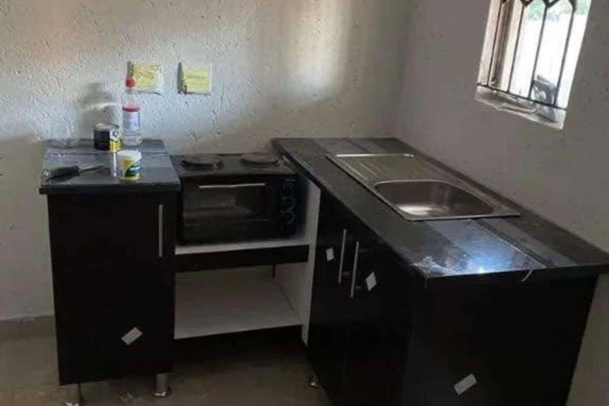 Fully furnished room with an open-plan kitchen, fitted with cupboards and wall units. Includes a private toilet and shower. Property features a secure access gate, parking space, and a surrounding security wall.