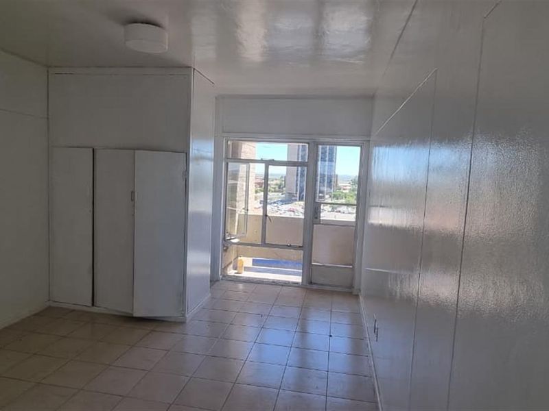 City-center living for young professionals in a secure CBD complex—studio with private balcony and separate kitchen, built-in cupboards, tiled floors and prepaid electricity; one bathroom.
