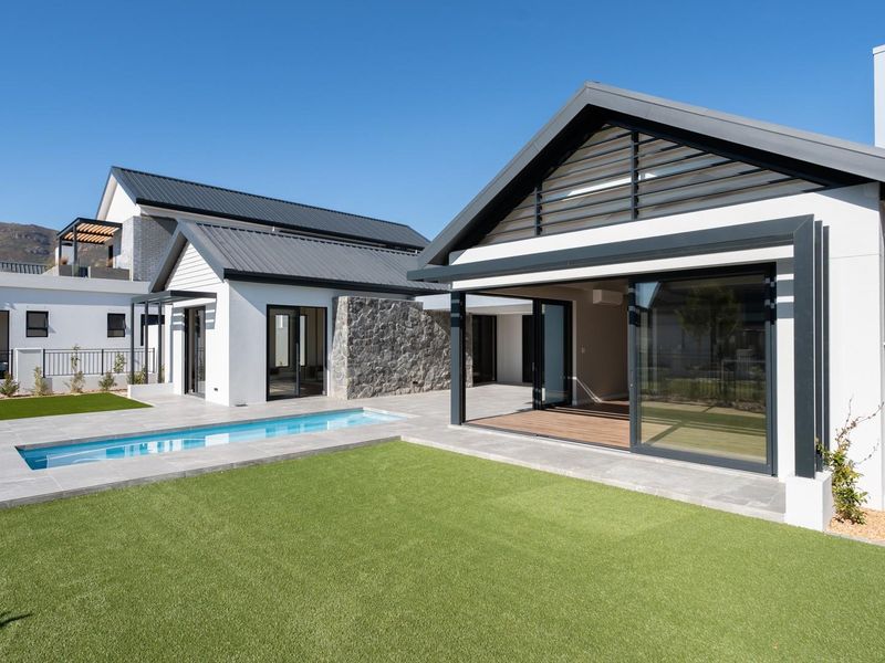Resort-style family living in Val de Vie's La Vue, framed by Cape Winelands and sunset mountain views, with glass stacker indoor–outdoor flow and private pool. Four bedrooms, four en‑suites.