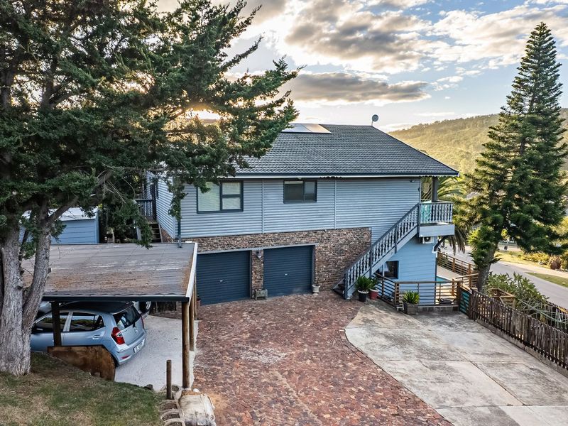 Relaxed coastal family living in Sedgefield — open-plan lounge and dining spill onto a deck and pool with sea views; covered braai and two home offices. Four bedrooms, two baths.