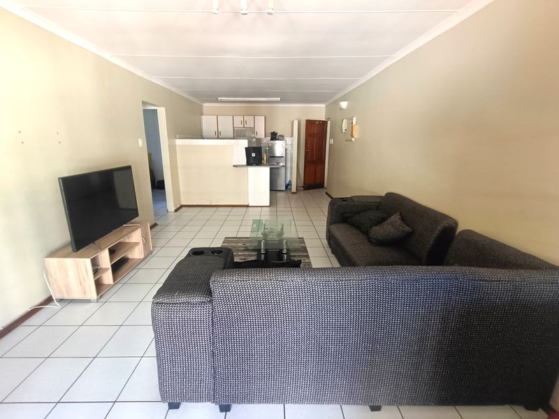 Effortless coastal living in Meer En See, Richards Bay — sunlit lounge opening to a patio with built-in braai room for entertaining; fully furnished, three bedrooms, one bathroom.