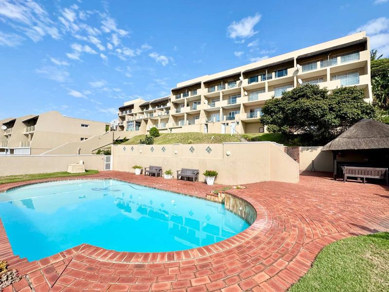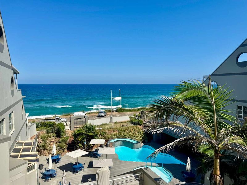 Effortless coastal living with uninterrupted ocean views in exclusive Umdloti — spacious balcony lets the waves in, fully furnished three-bedroom, two-bath apartment with covered parking, steps to cafés.