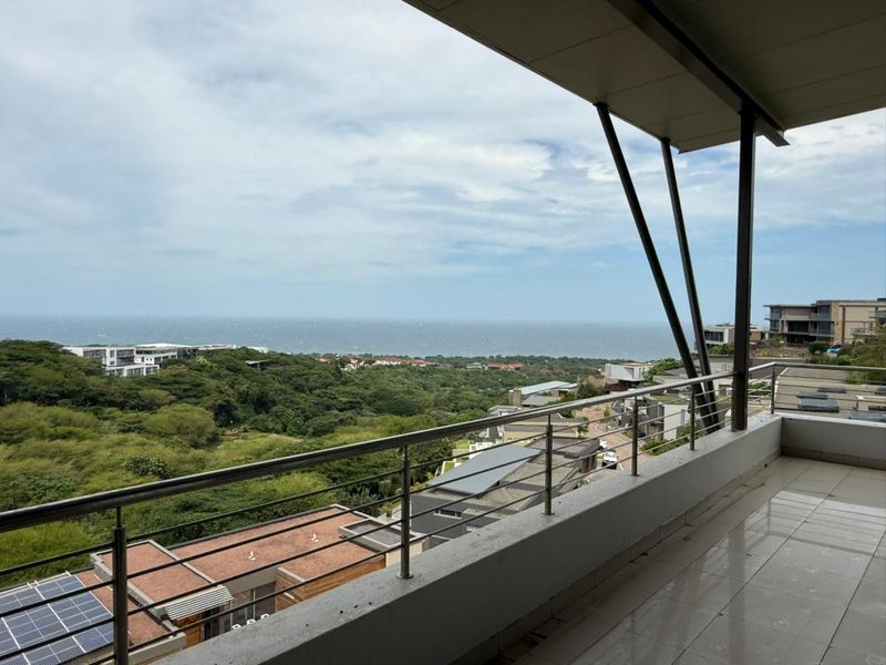 Coastal estate lifestyle near Umhlanga and Gateway — Ilala Ridge living with enclosed balcony and sweeping sea views, open-plan layout, partially furnished, four bedrooms, three baths and double garage.
