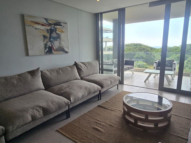 Relaxed coastal lifestyle in Umhlanga with a private patio overlooking peaceful views, open-plan living and modern granite kitchen; two bedrooms, two en-suite bathrooms and covered parking.