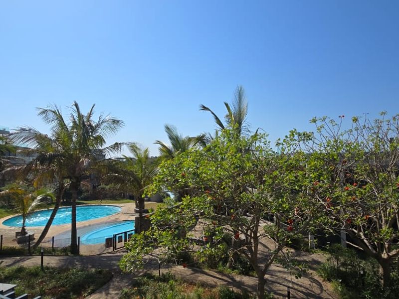 Relaxed, secure lifestyle in Umhlanga Ridge with ground-floor open-plan kitchen/living, communal pool and braai area — two bedrooms, one bathroom and covered parking.