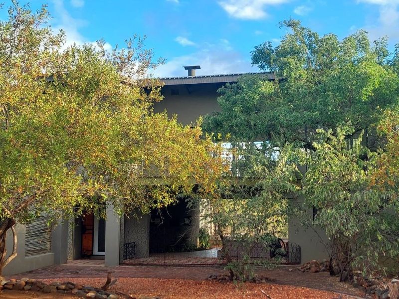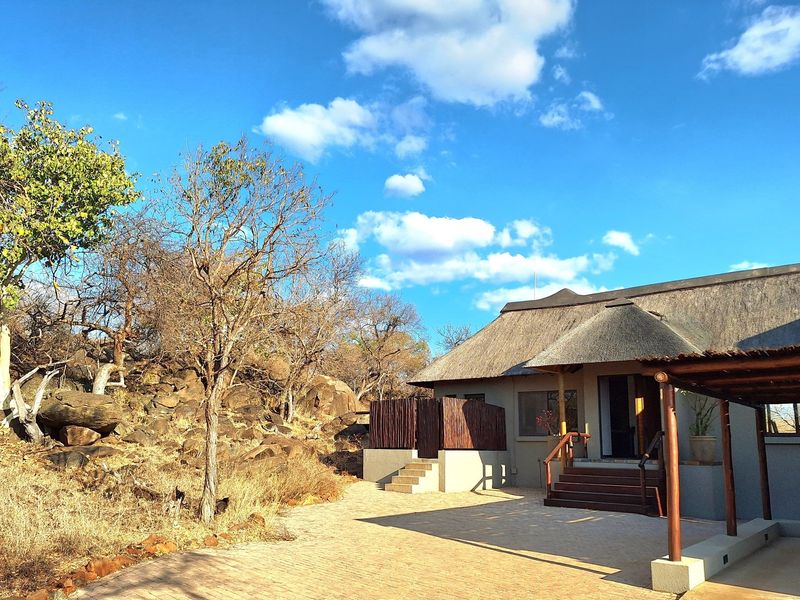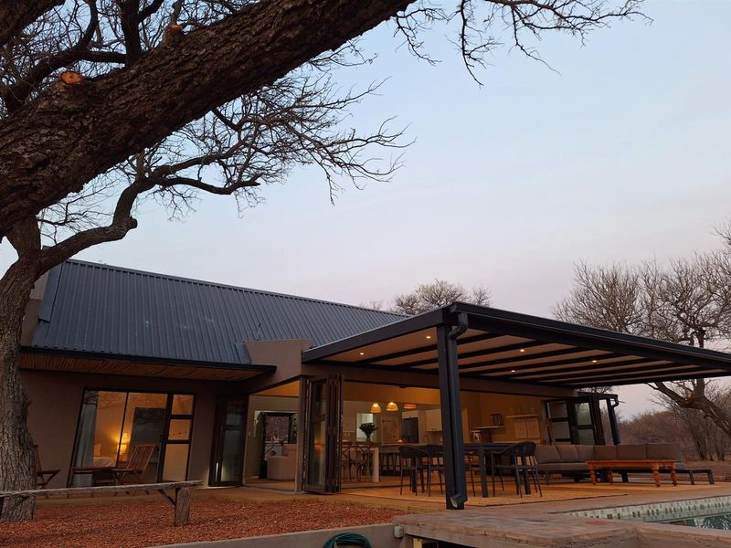 Bushveld retreat in Raptors View Wildlife Estate, living among game and birds; covered thatch patio, pool and raised fire pit beneath Maroela and Knob Thorn trees. Three bedrooms, two bathrooms.