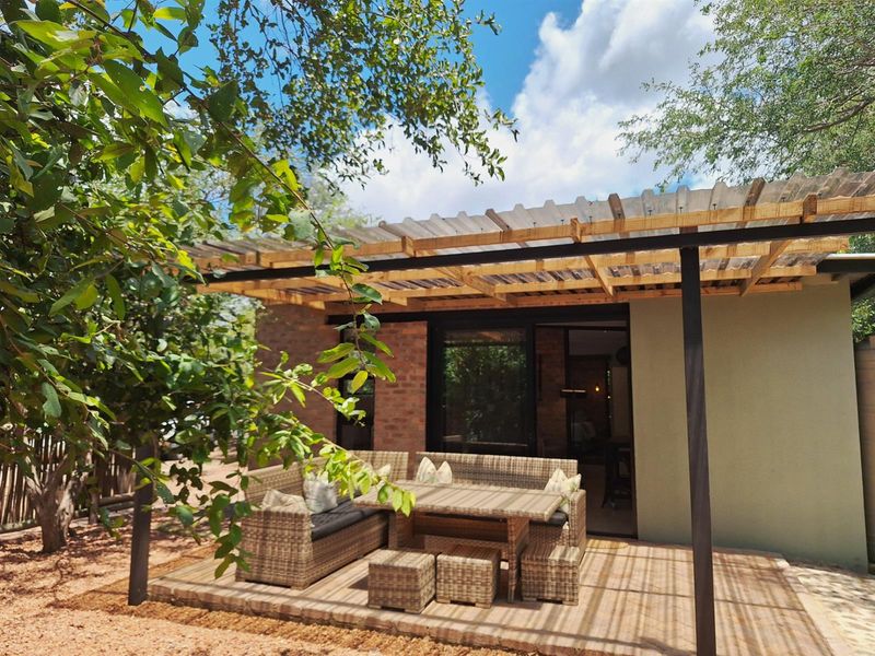 Bushveld living near Hoedspruit in a secure Big Game Estate, offering indoor/outdoor flow, covered patio and outdoor showers — fully furnished two-bedroom, two-bath rental.