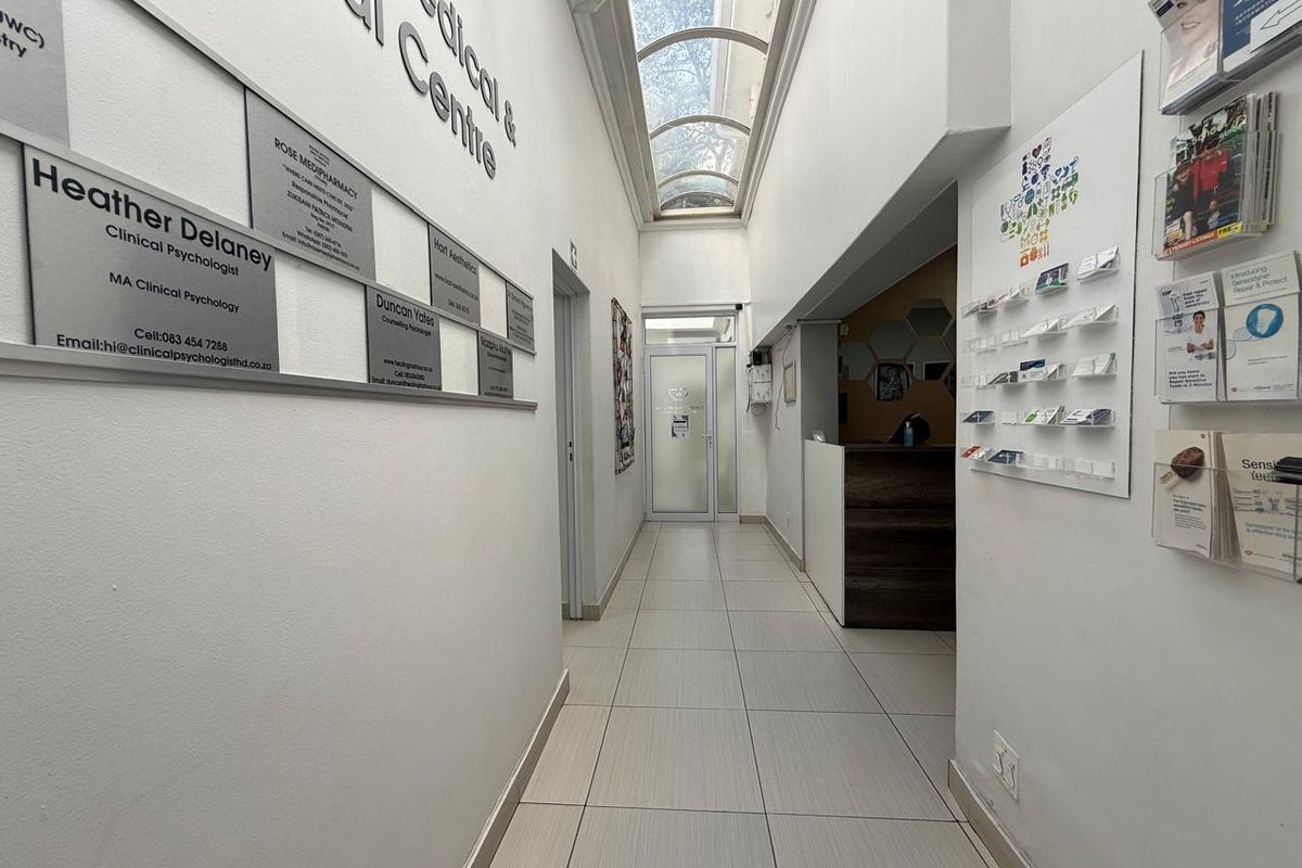 The suite is equipped with air conditioning, providing a comfortable environment for both practitioners and patients. Priced at R11,500 per month (exclusive of VAT), this offer is all-inclusive, covering essential amenities such as Wi-Fi, utilities, and parking. Additionally, tenants have access to a communal kitchen and benefit from onsite security, ensuring a safe and convenient working environment.