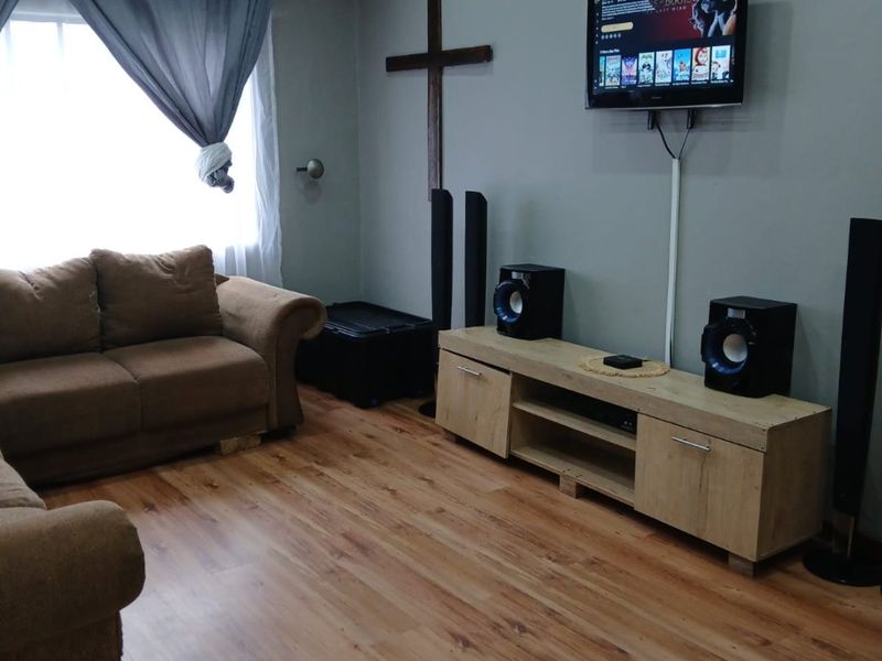 Family- and pet-friendly home in a quiet neighborhood, perfect for outdoor living — braai room, back patio, jungle gym and wendy houses for storage/laundry. Three bedrooms, two bathrooms, double enclosed carport.