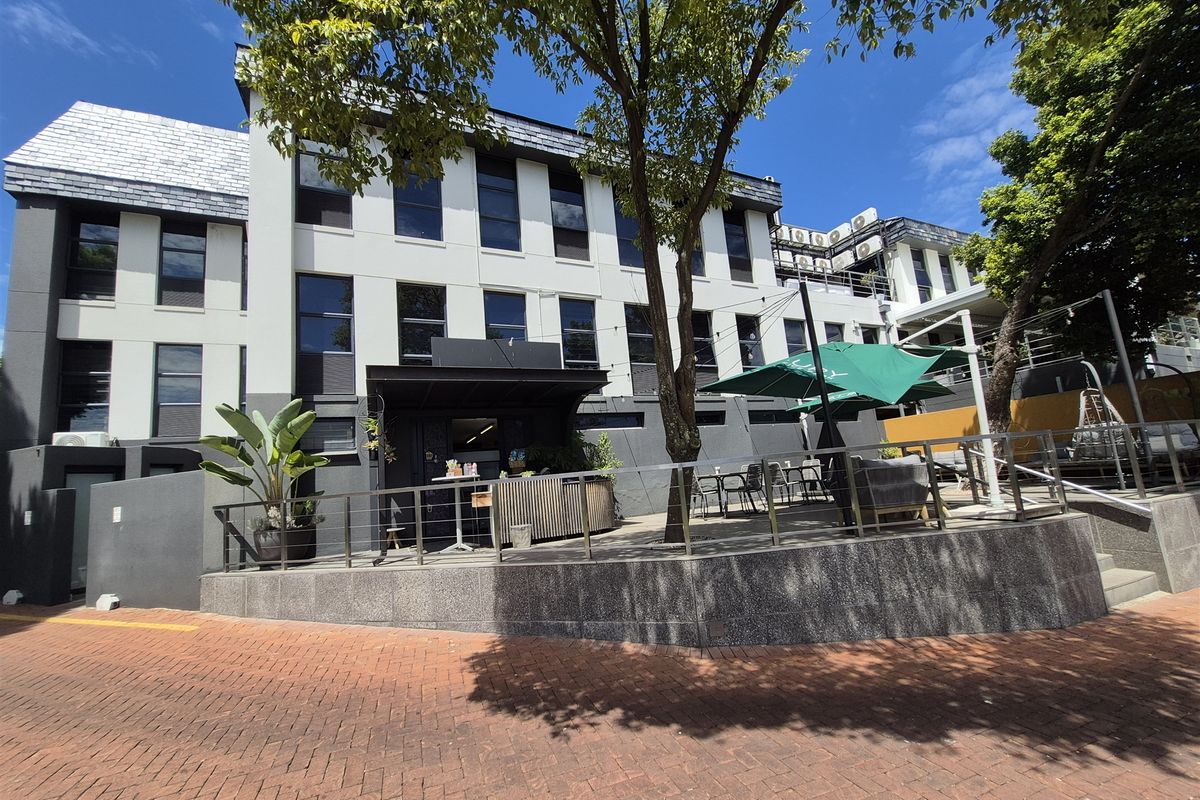 Enjoy a park-like work environment opposite Hyde Park Corner, with easy Sandton/Rosebank access — office suite features private garden-facing patio, industrial kitchen and three large offices.