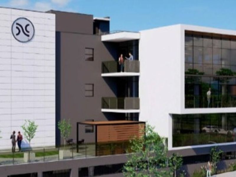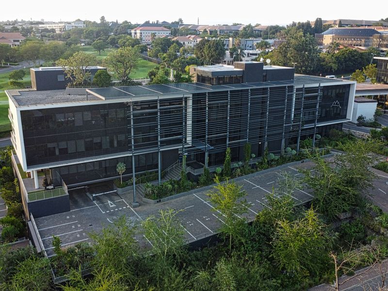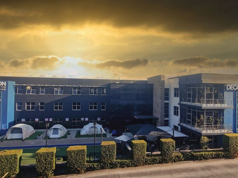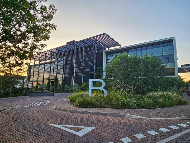 Prime Bryanston office lifestyle with exceptional visibility on Sloane Street — premium fitout, rental holiday until 31 Jan 2026, landscaped gardens and outdoor seating.