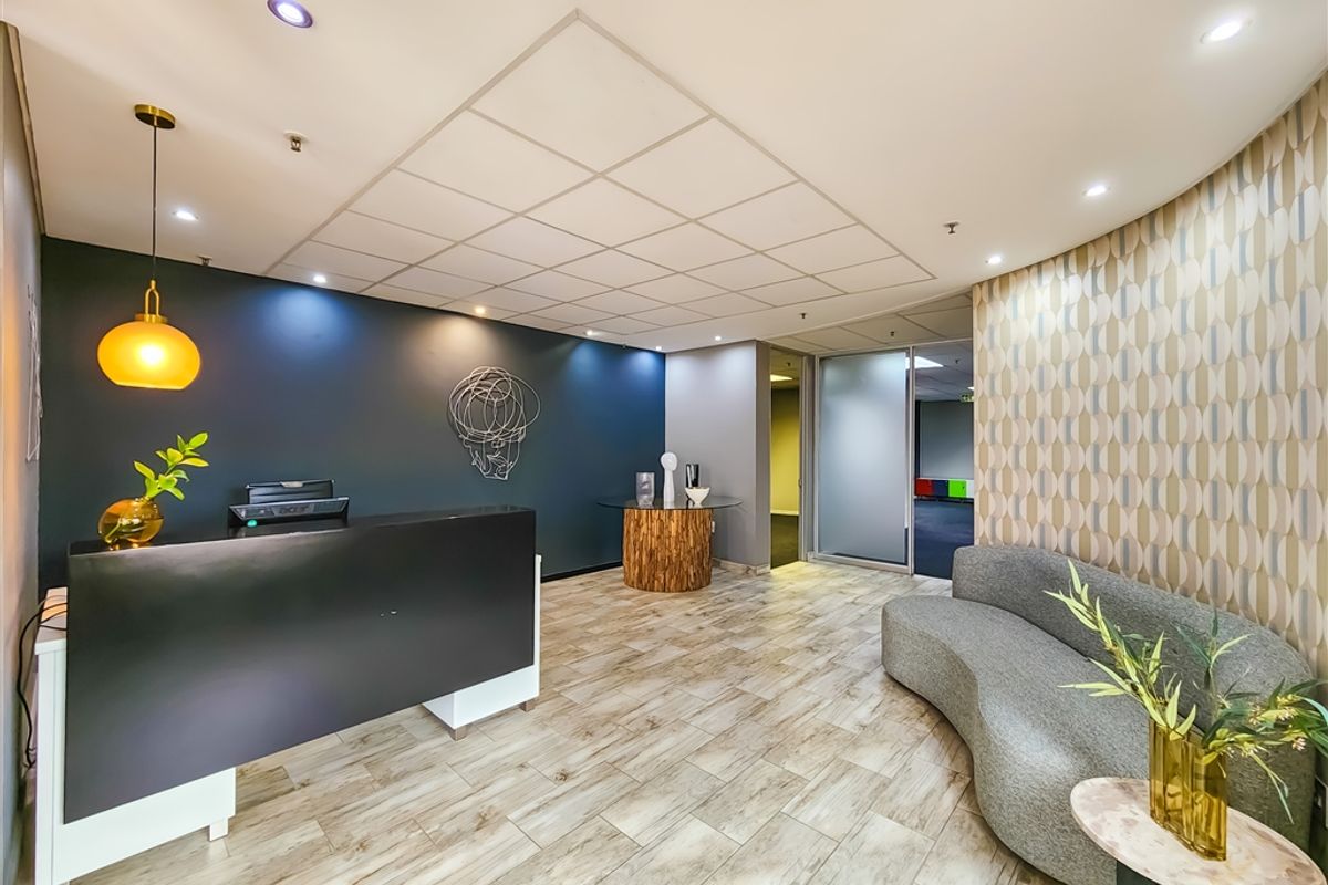 This modern ground-floor office space available to let in Fourways Golf Park offers a well-designed and functional layout. The space welcomes you with a professional reception area, leading into a small meeting room and a well-appointed boardroom. The back-office area is thoughtfully separated from the reception and comprises three private offices, a spacious open-plan workspace, and a generously sized kitchen that comfortably accommodates seating options.