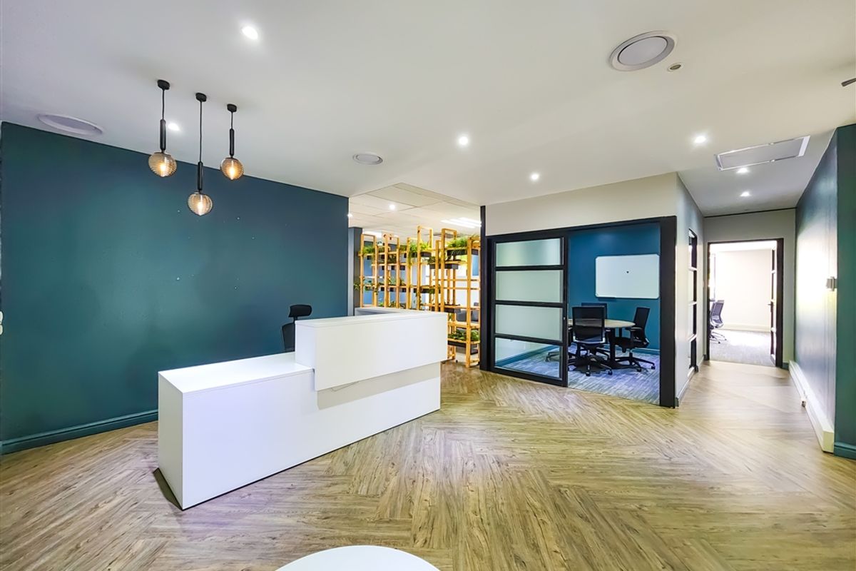 This contemporary ground-floor office space available to let in Design Quarter offers both convenience and a refined professional setting. Upon entry, you are welcomed by a modern reception area, leading seamlessly into a private meeting room and a spacious, well-appointed boardroom. A central passage guides you to five private offices, a generous open-plan workspace, and a private dedicated kitchen, providing a well-balanced layout for both collaborative and individual work.