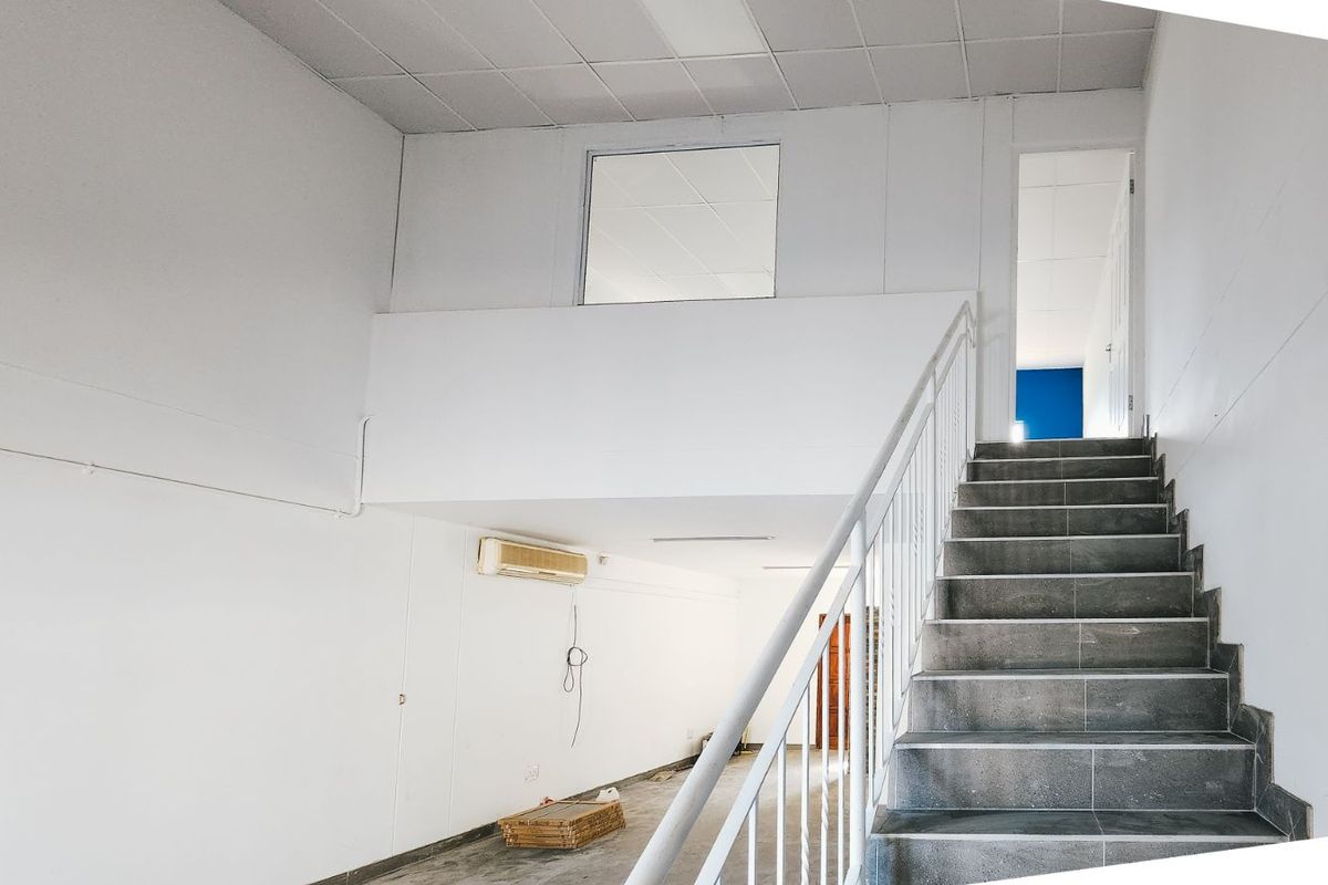 The space features an open-plan interior with a mezzanine level, offering additional office or storage space. A private kitchenette and dedicated toilet ensure convenience, making the unit fully self-contained and suitable for day-to-day business operations.