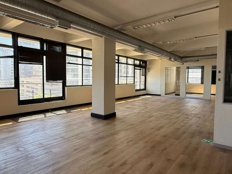Vibrant CBD workspace on Waterkant Street, steps from Bree Street cafés and MyCiTi. Open-plan 372 m² second-floor unit above an active boxing gym, offering great exposure and shower provision.