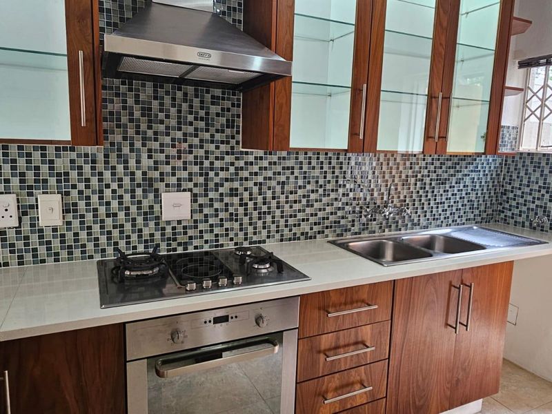 Low-maintenance pet-friendly townhouse in gated Sunninghill Gardens, steps from Chili Lane, Sunninghill Village and Mall of Africa; weekly serviced garden, two en-suite bedrooms and guest bathroom.