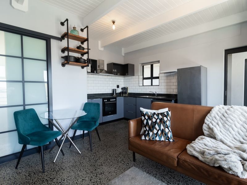 Beachside living steps from Bloubergstrand's beachfront at Manhattan On Coral, with a private balcony offering partial sea views, modern open-plan kitchen, two bedrooms, one bath, two parking bays.