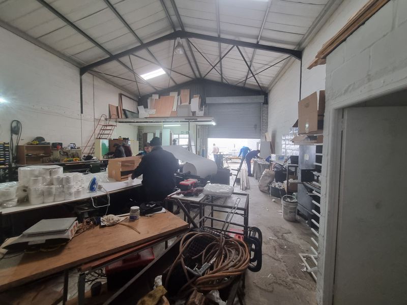 150m² industrial factory warehouse for rent in Brackenfell Industrial. 2 bathrooms, office, reception, and ample parking. R11,000/month.