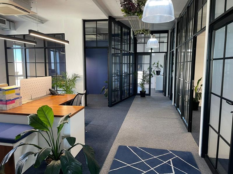 Grow your business in a light-filled Southern Suburbs office, enjoying leafy views and industrial-chic design — featuring black-framed glass partitions, a full modern kitchenette and secure parking.