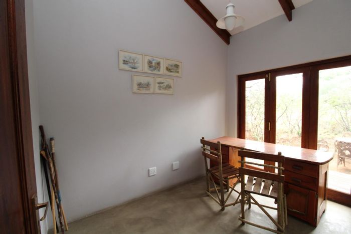 Experience safari-style bushveld living near Mabalingwe, Mabula and Zebula reserves, with off-grid living, expansive seasonal dam for canoeing and boma braai — four bedrooms, two bathrooms.