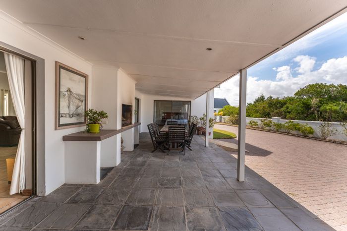 Entertainer's coastal retreat in St Francis Bay near St Francis Links, with wrap-around undercover patio and built-in gas braai, garden and golf-course views, four en-suite bedrooms, double garage.