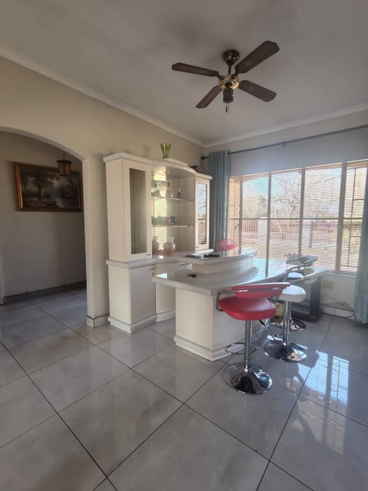 Resort-style family living in Sasolburg, moments from schools and shops, with huge lapa — Harvey-tiled roof, built-in bar, braai and jacuzzi, pool, borehole, caravan parking; 3 beds, 2.5 baths.