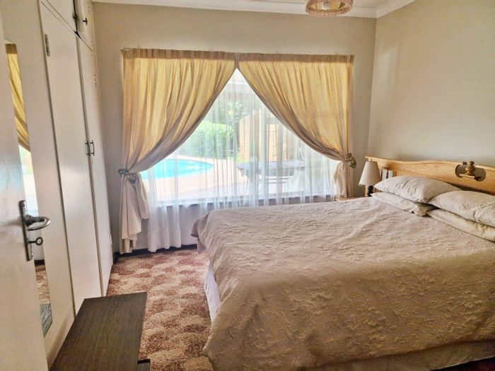 Resort-style entertainer's paradise in a private, peaceful setting — sparkling pool, fire boma and pizza oven. 4-bed, 3-bath home with flatlet, study, solar backup, double garage.