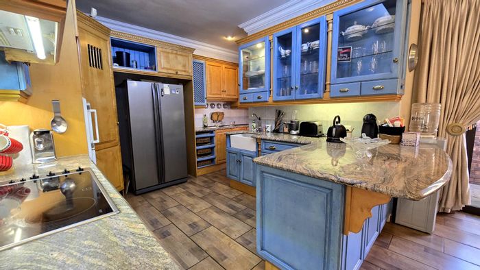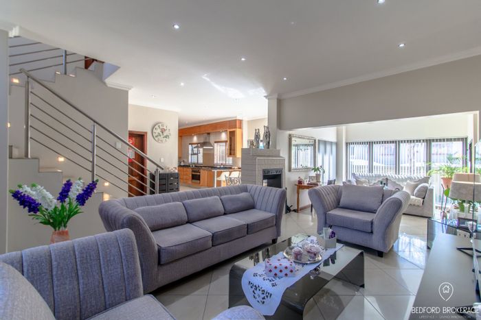 Exclusive estate entertainer's home with double‑volume entrance, gourmet sleeper‑wood kitchen and built‑in bar, indoor/outdoor braais, ground‑floor main suite, upstairs pajama lounge and gym — 4 beds, 3.5 baths, 3 garages.
