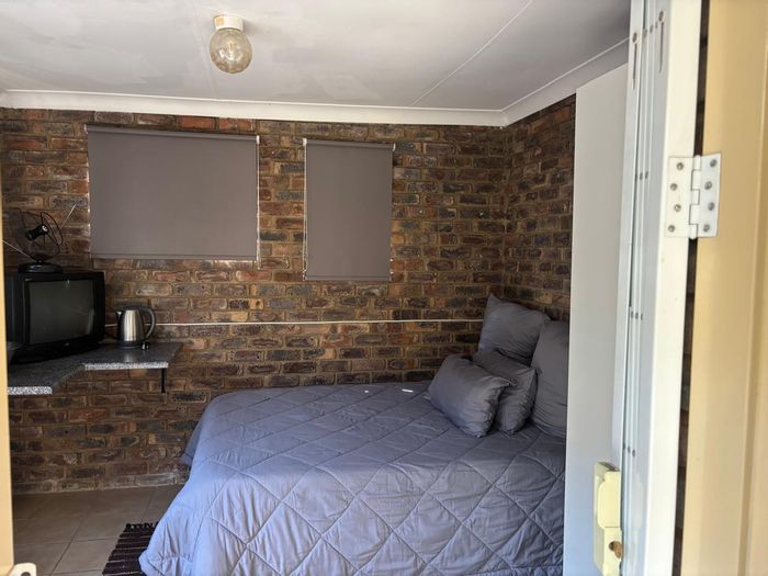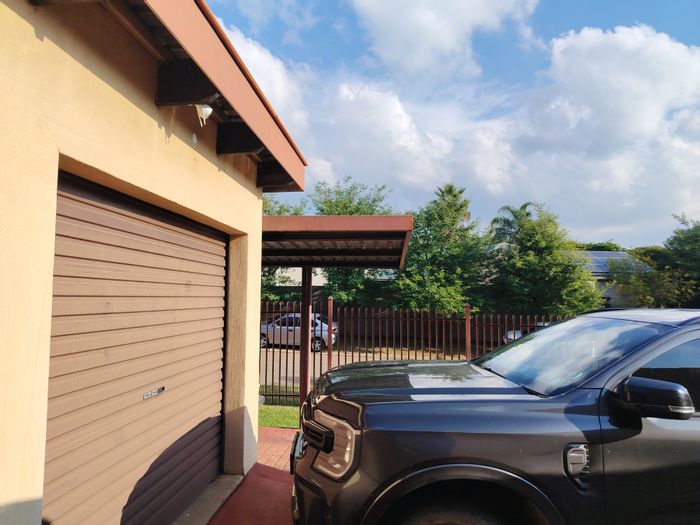 Corner duplex in Serene Street, Garsfontein — peaceful spruit views and abundant birdlife, renovated Caesarstone kitchen, custom wall unit, covered patio with braai and neat garden. Two beds, lock-up garage.