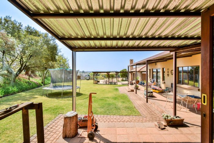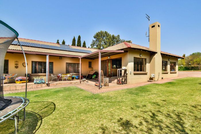 Entertainer's family retreat set on a 5,300m² garden stand in quiet gated grounds, with pool, deck and 3,500L/hr borehole plus solar backup — five bedrooms, 4.5 baths, double garage.