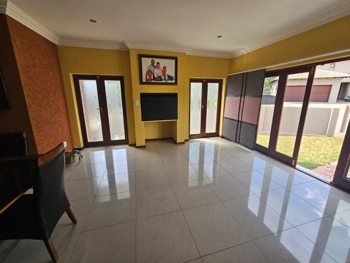 Family-focused entertainer in Boardwalk-Olympus East Pretoria, close to Woodlands Mall and Menlyn Maine, featuring an enclosed patio with built-in braai, pool, five bedrooms, 3.5 bathrooms and double garage.