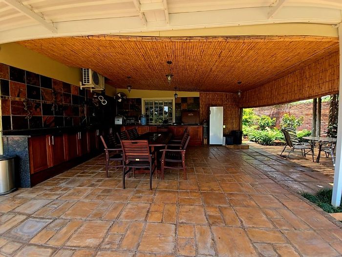 Thatched double-story retreat in a boomed-off, 24-hour guarded estate — balcony TV lounge, open-plan kitchen with scullery, poolside irrigated garden and automated double garage; 3 beds, 2 baths.