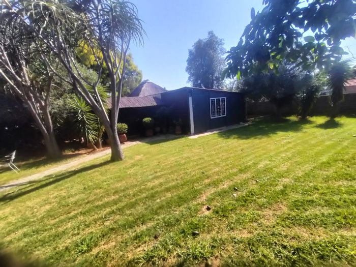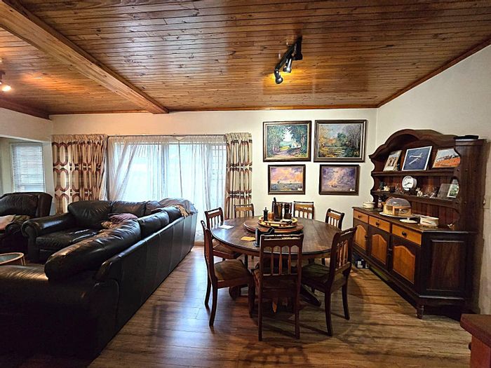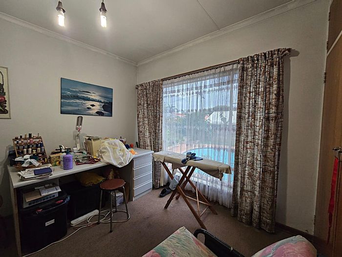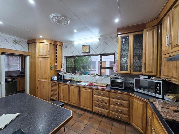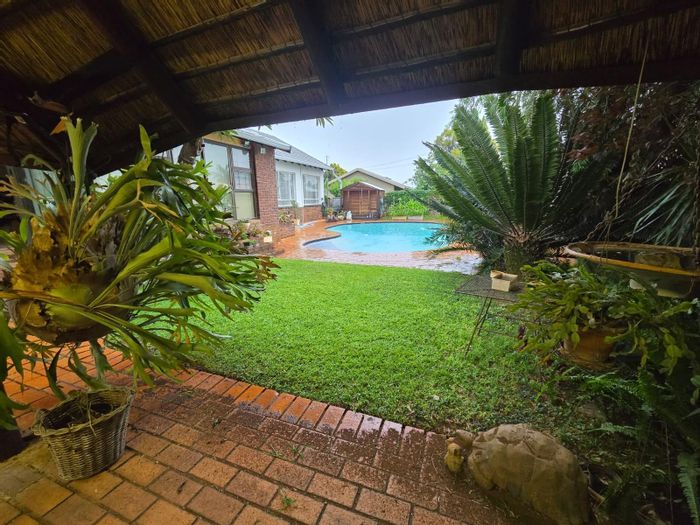 Entertainer's haven in a quiet, leafy neighbourhood — expansive living flows to a thatched lapa with built-in braai and enclosed pool. Four bedrooms (two en-suite), garage for 4–5 cars.