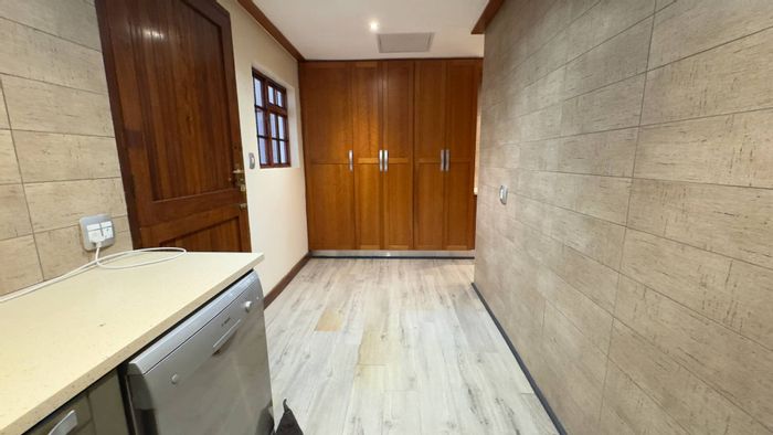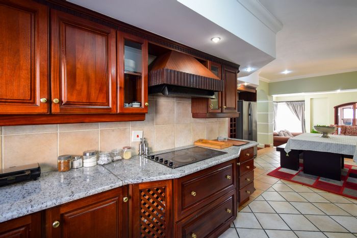 Entertainer’s double-storey sanctuary in secure Waterkloof Ridge, offering rooftop patio, L-shaped balcony, pool, private irrigated garden and two modern kitchens — five beds, three baths, double garage.