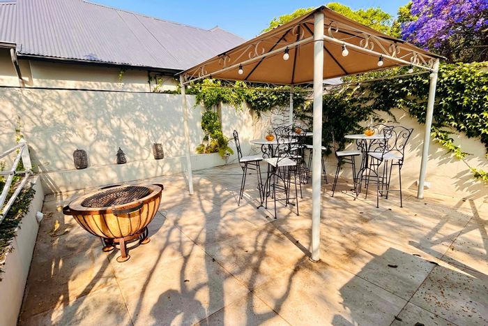 Entertain effortlessly in leafy Waterkloof, beneath jacarandas and near the country club; rooftop bar with fire pit, pool, covered veranda and guest flatlet — four bedrooms, four bathrooms.