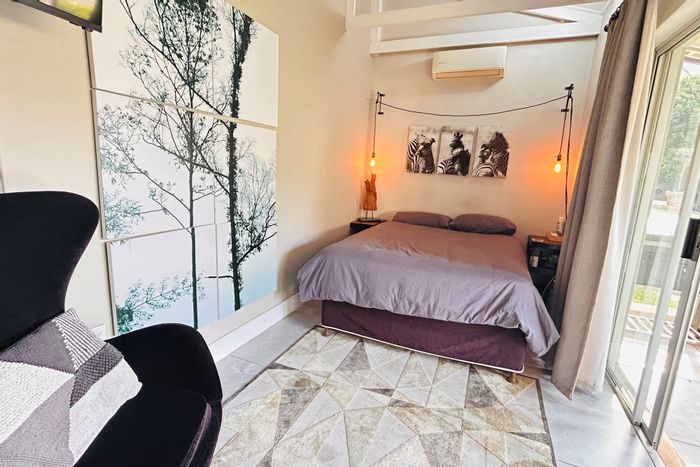 Relax in exclusive Waterkloof living under jacarandas, moments from the country club, with a rooftop bar and fire pit, pool, and four bedrooms, four bathrooms.