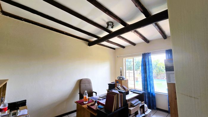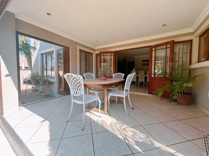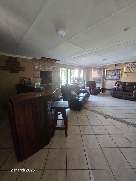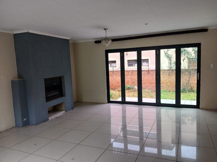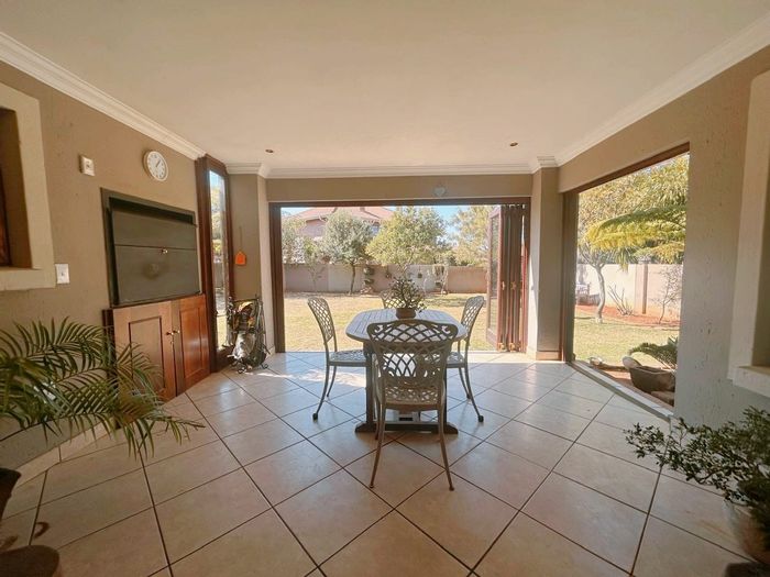 Exposed-beam open-plan family home in exclusive Rayton estate — frameless glass doors open to a vast entertainment patio, cosy fireplace, ensuite main and two garages, 20 minutes to Pretoria.